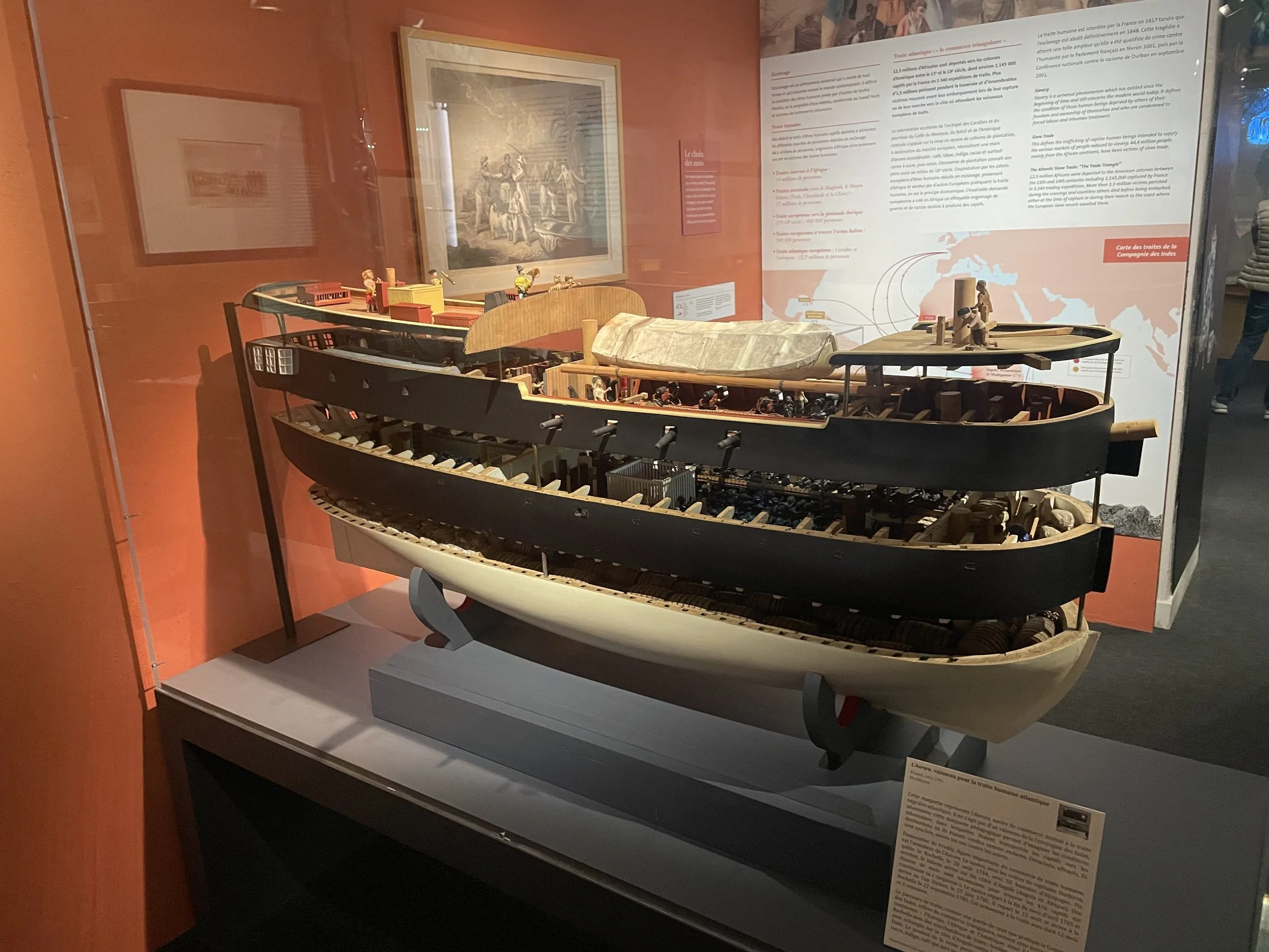 In the exhibit dedicated to slavery there is a model of a slave ship…it’s named the l'Aurore. I’m not 100% sure, but it may be a model of the first slave ship used in the Louisiana slave trade. The first slave ship to bring enslaved people to Louisiana was also named l’Aurore. The art label didn’t mention its journey to Louisiana.